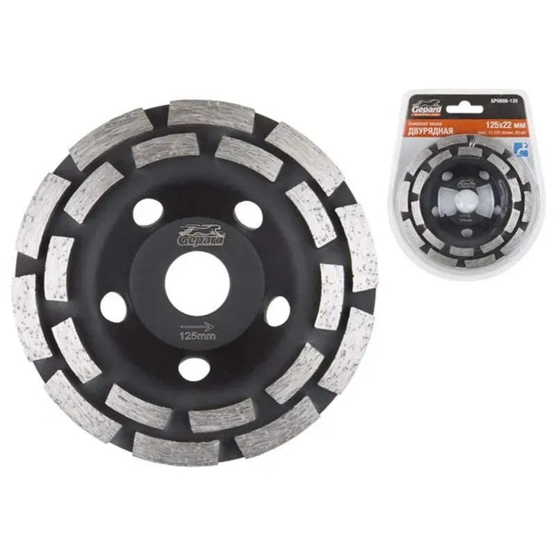 Чашка алмазная шлифовальная двурядная GEPARD 125х22.2мм GP0808-125 - применяется для интенсивной грубой зачистки выпуклых и неровных участков, снятия толстых слоев бетона, удаления швов и наплывов с бетонных, гранитных, мраморных, кирпичных, каменных и других особо твердых поверхностей. Изделие является сменной составной частью углошлифовальных или мозаично-шлифовальных машин, имеющих посадку 22,2 мм. Высокий ресурс использования.