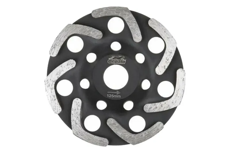 Чашка алмазная шлифовальная бумеранг GEPARD 125x22.2мм GP0807-125 - применяется для финишного шлифования бетонных, гранитных, мраморных, кирпичных, каменных и других особо твердых поверхностей. Предназначена для снятия небольшого слоя материала на прямых поверхностях. Поверхность после обработки становится идеально ровной. Изделие является сменной составной частью углошлифовальных или мозаично-шлифовальных машин, имеющих посадку 22.2 мм. Высокий ресурс использования. На фрезах используется мелкофракционная алмазная крошка.
