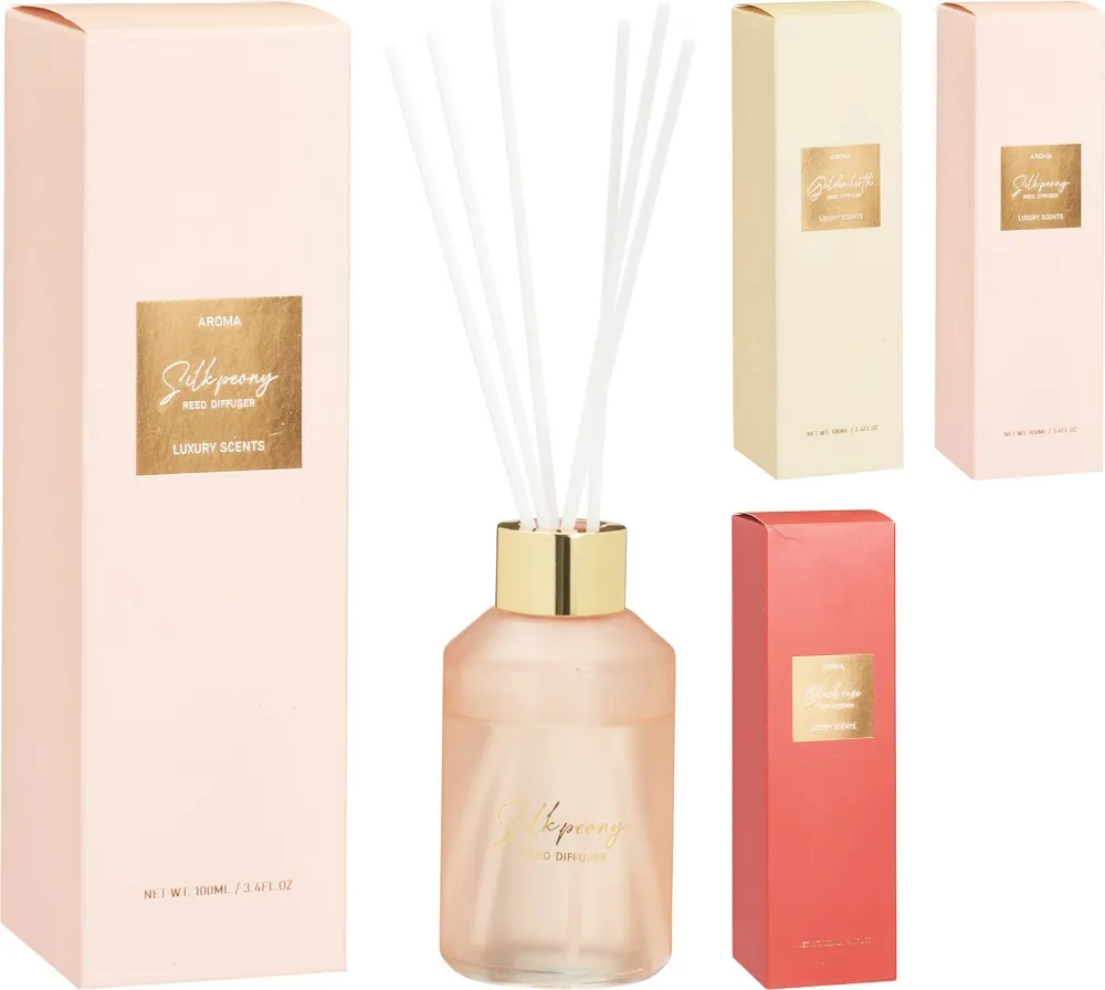 Набор включает емкость с ароматической жидкостью объемом 100 мл и палочки. Три аромата в ассортименте - Silk peony, Golden birth, Black rose - помогут создать приятную атмосферу. Стильный дизайн позволяет использовать наборы в качестве приятного подарка родственникам, друзьям и коллегам.