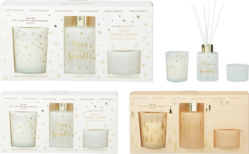 Набор включает емкость с ароматической жидкостью объемом 60 мл, палочки, ароматическую свечу, залитую в стакан, и подсвечник. Два аромата в ассортименте - Amber Wood, Fresh Linen - помогут создать праздничную атмосферу. Приятный дизайн упаковки позволяет использовать наборы в качестве подарка родственникам, друзьям и коллегам.
