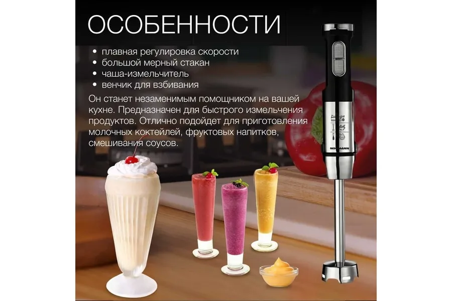 Погружной блендер NORMANN AHB-812 отличается повышенной мощностью, что делает его незаменимым при приготовлении сложных блюд. Он легко справляется не только с фруктами и овощами, но и с орехами или льдом. Насадки из прочных материалов гарантируют долгий срок службы. Эргономичный корпус и удобные кнопки управления позволяют работать комфортно и безопасно. Блендер имеет несколько скоростей для идеального результата в разных задачах. Простая система ухода экономит ваше время, а универсальность делает его настоящим помощником на кухне.