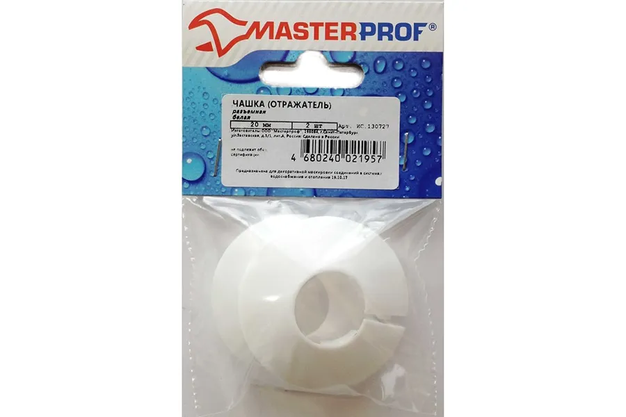 Разъемная пластиковая чашка диаметром 20 мм используется для маскировки монтажных отверстий и трубопроводных соединений. Белый цвет и аккуратная форма гармонично сочетаются с интерьером. Поставляется в комплекте из двух штук.