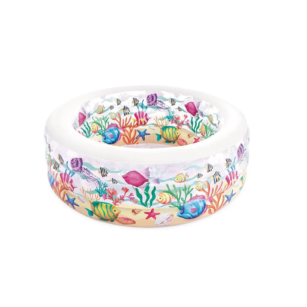 Прозрачный бассейн круглой формы с разноцветными рыбками изготовлен из высококачественного винила толщиной 0,3 мм. Конструкция изделия включает 4 воздушные камеры. Надувное дно является особенностью модели, обеспечивающей повышенную безопасность и комфорт использования. Сливной клапан облегчает уход за бассейном. Диаметр модели - 152 см, высота борта - 56 см, вместимость 360 литров. Подходит для детей от 6 лет.