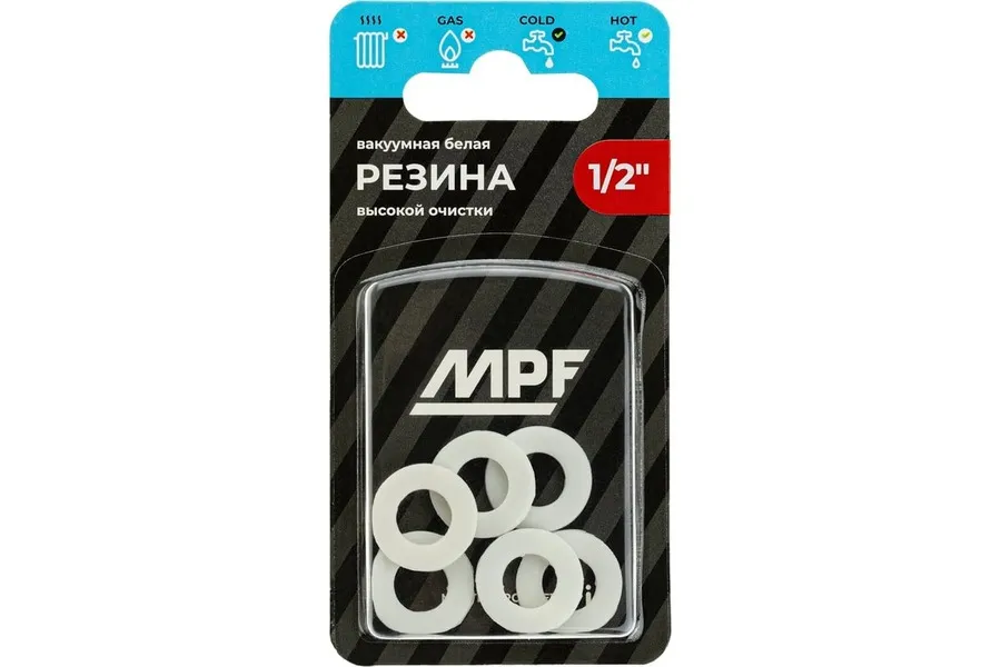 Белые резиновые прокладки MPF диаметром 1/2" для использования в водопроводных и сантехнических системах. Изготовлены из прочной резины, устойчивой к воде и перепадам температуры. Обеспечивают плотное прилегание и надежное уплотнение соединений. В упаковке 6 шт.