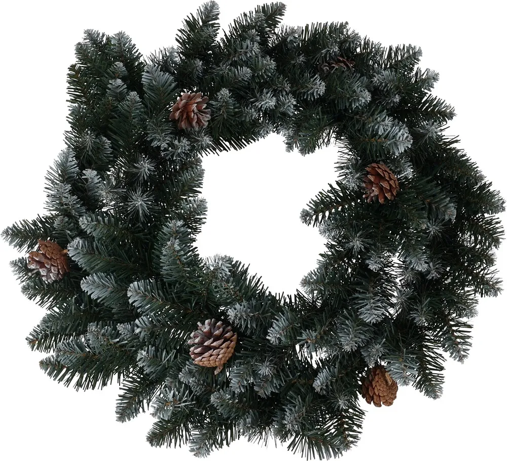 Рождественский венок из еловых веток, украшенный шишками с иголками, словно покрытыми инеем. Декор изготовлен из качественных полимерных материалов.